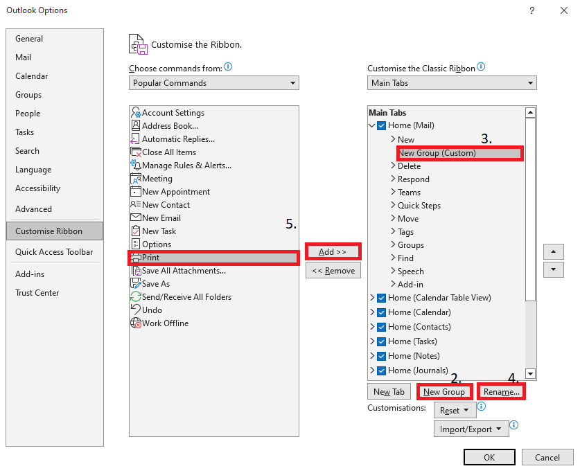 Step 5: Click on the group and select Print from the left column. The new group and the Print command should be highlighted in blue and gray. Now, click on the Add box between the two columns. Then click on OK at the bottom right.