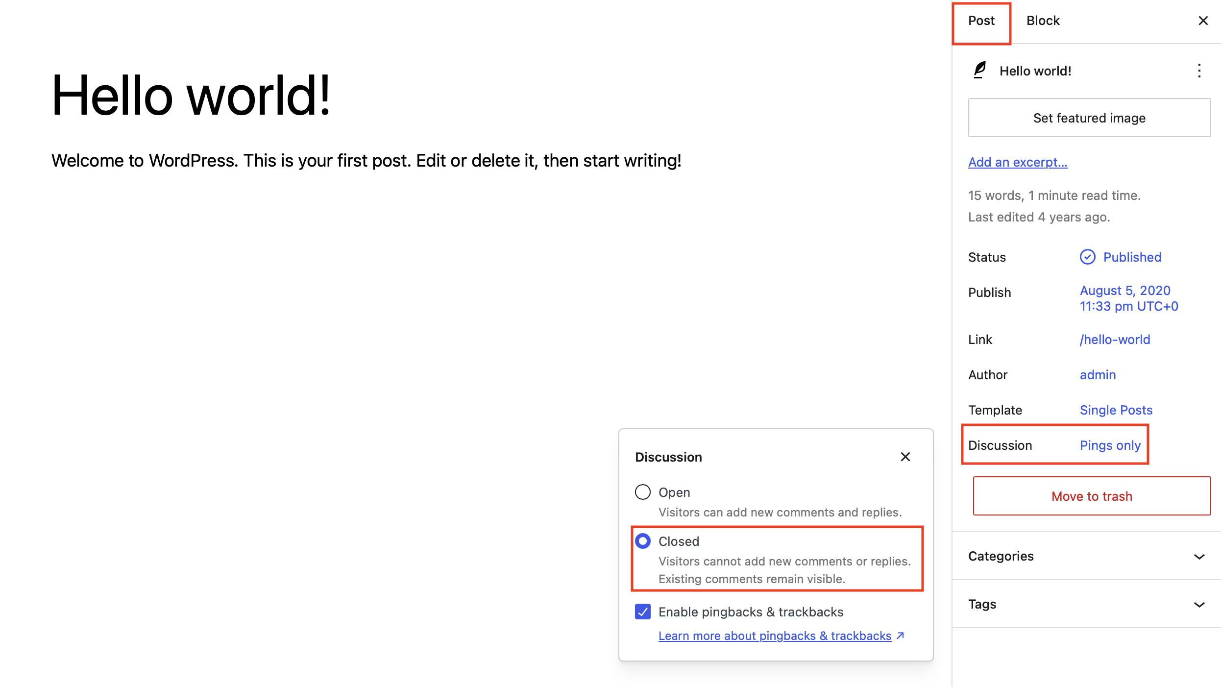 Step 2: The corresponding page or post opens in the Gutenberg Editor. Now click “Post” in the right sidebar (“Info Box”) and then on the “Discussion” entry. You can check “Closed” if you want to disable WordPress comments. To apply the changes, click “Update” at the end.