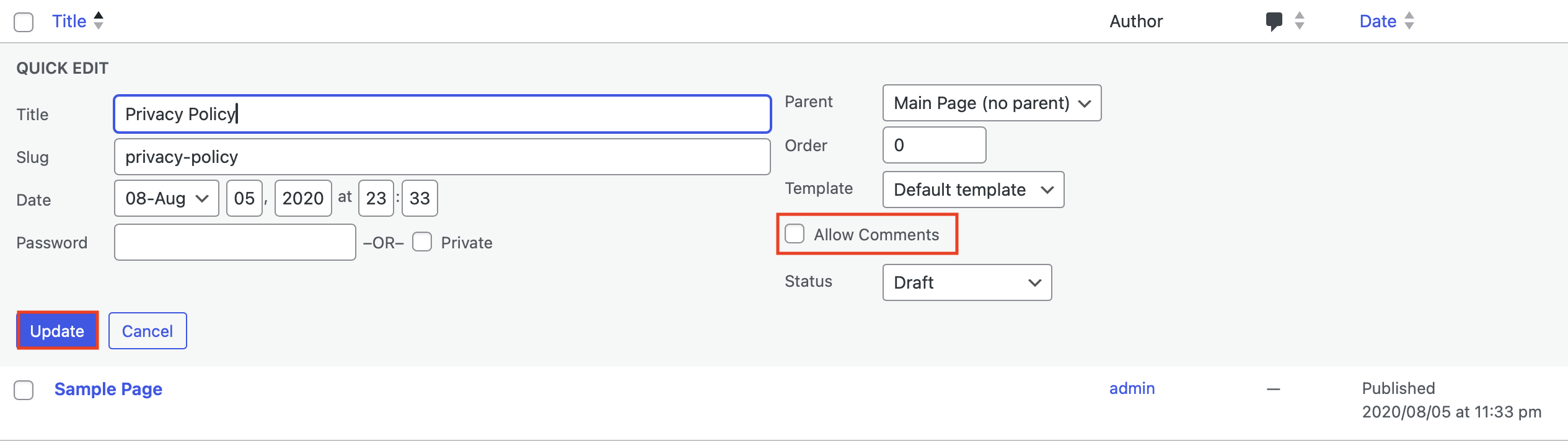 Step 3: The “Quick Edit” field will now appear, allowing you to make quick settings for the relevant page. Simply check the box for “Allow Comments” and then click the blue “Update” button. This will enable comments for the specific page. If you want to disable WordPress comments, just remove the checkmark from the respective page and click “Update.”