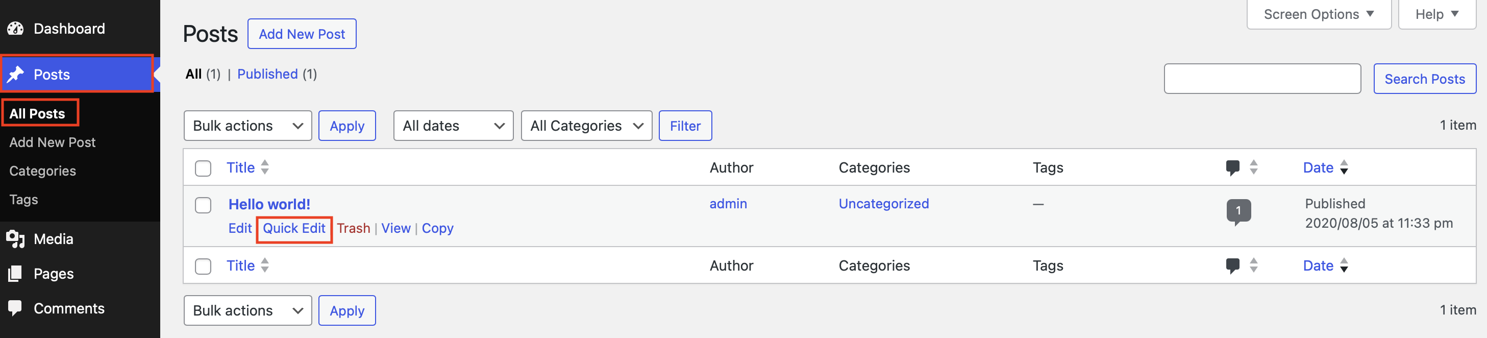 Step 2: Now hover your mouse pointer over the post for which you want to disable the comments. Below the post name, you will see the fields “Edit,” “Quick Edit,” “Move to Trash,” “View,” and “Copy.” Click on “Quick Edit.”