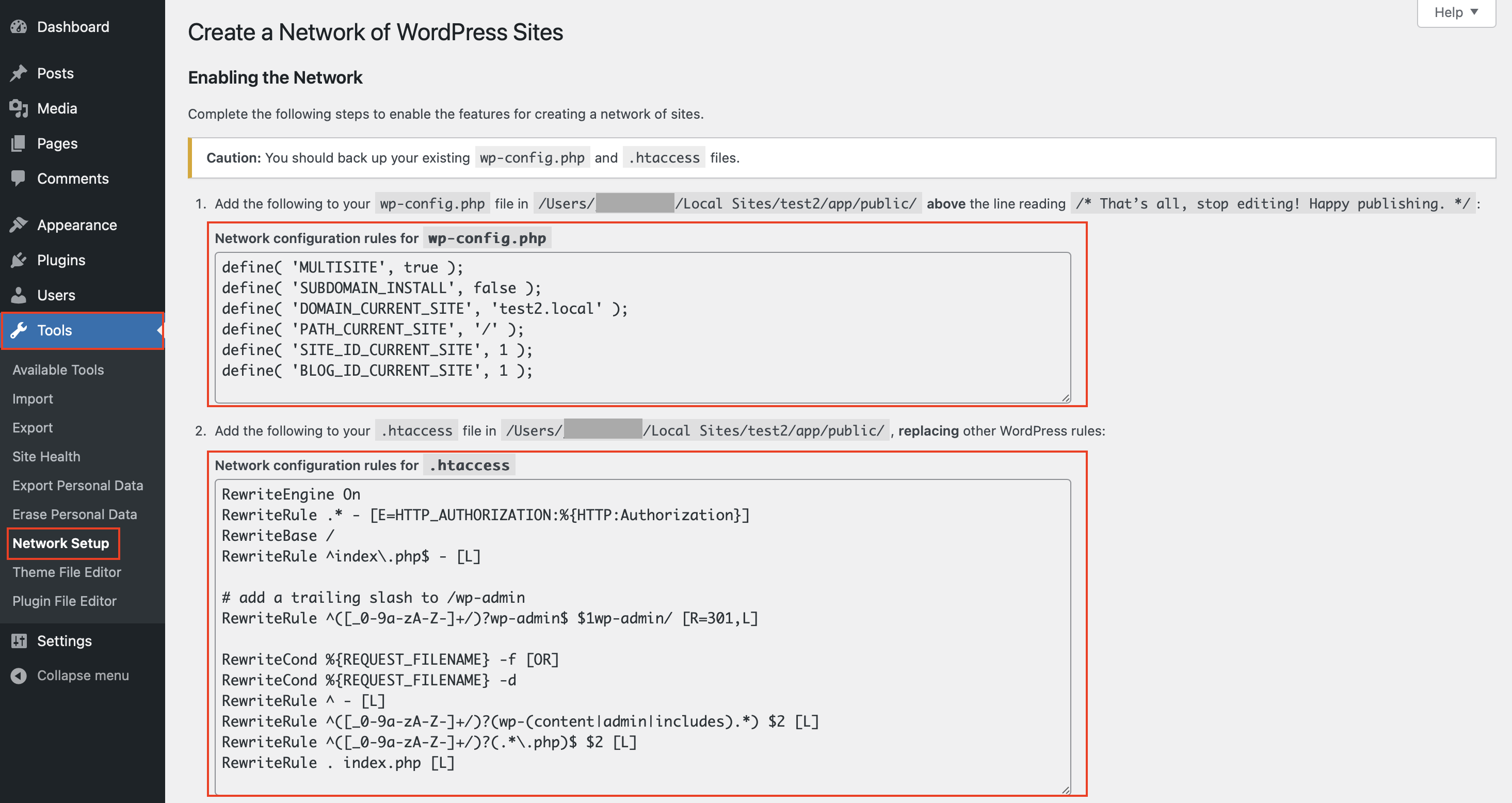 Step 4: After completing the previous steps, open your WordPress dashboard—you may need to refresh it. In the “Tools” section, you’ll now see a new option called “Network Setup.” When you open it, you can choose whether your new multisite network will use subdomains or subdirectories. Then, enter a network title and your email address as the network administrator. Click “Install” to continue.