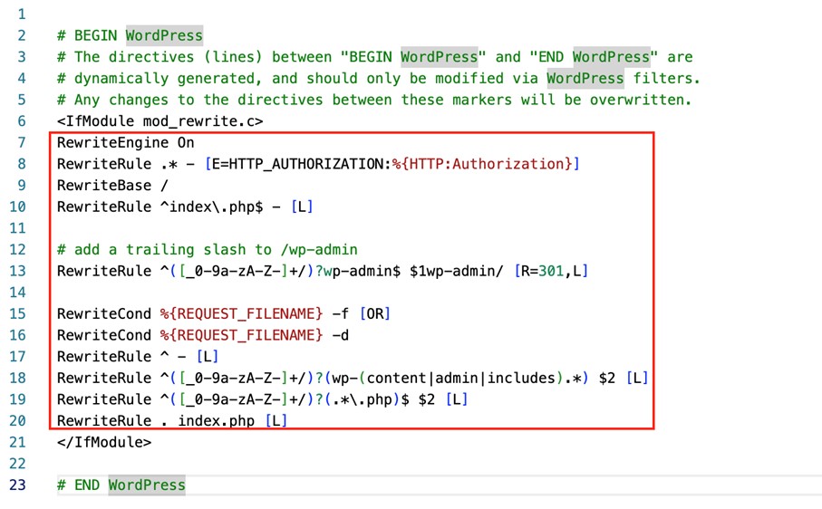 Step 7: Now repeat the process with the second code snippet from the WordPress dashboard and the .htaccess file. In most cases, this means replacing existing code with the code provided by WordPress. A typical .htaccess file with the code to be replaced might look like this: