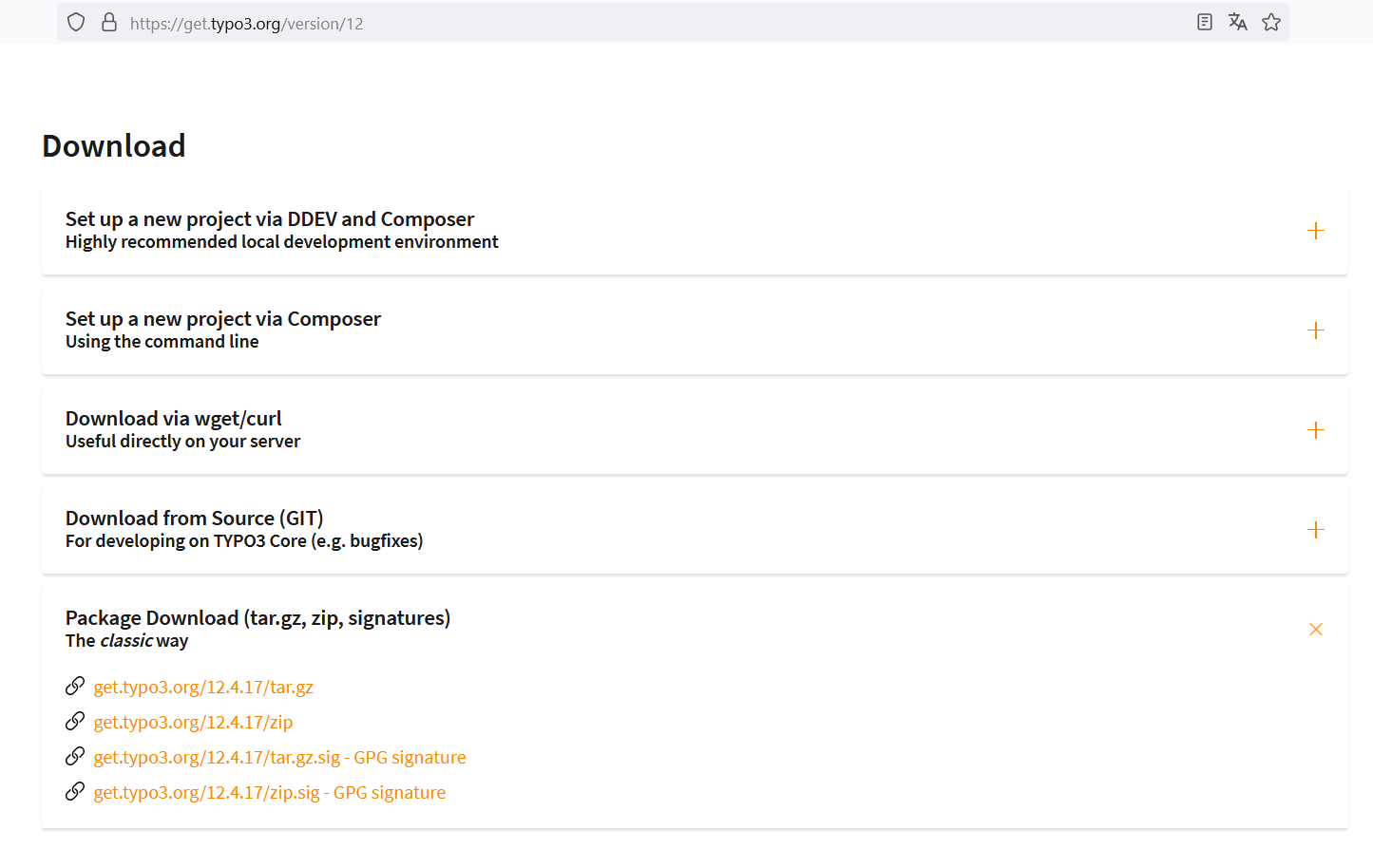Step 2: To demonstrate the classic method, we download TYPO3 as a compressed .tar file. This solid tar compression is suitable for Unix/Linux systems. Windows users should download the .zip file. The GPG-signed packages (at the bottom of the page) ensure the authenticity of the downloaded program. This version is recommended for professional users.