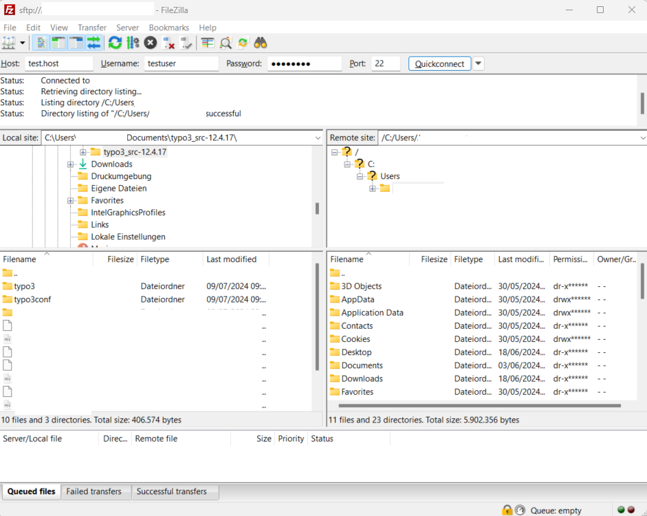 Step 8: Once settings are configured, drag the TYPO3 folder from your local storage (visible in the left-hand pane) to the remote server window on the right. Place the folder in your root directory (denoted as “/” on Unix-like systems).