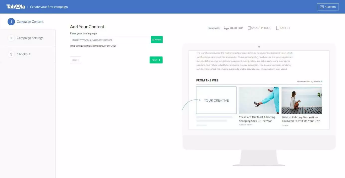 Similar to Outbrain, Taboola is a content distribution network, making it another interesting alternative to Google AdWords. At best, the differences between Taboola and its rival Outbrain are very minimal. Creating a campaign works just like with the latter: In just three steps (selecting and customizing content, choosing reach and budget, entering account information) you can get your content marketing campaign online. One thing that is different, however, is the choice of content. While Outbrain only allows actual articles, Taboola also allows you to promote landing pages as well as entire websites. But according to the guidelines, linking to a website's homepage or directory is not allowed. Links to forum posts are also not permitted. On top of this, Taboola naturally prohibits content deemed to be fraudulent, offensive, and/or illegal.