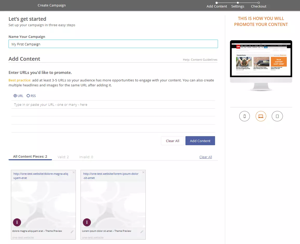 When creating a campaign, you select both the title and preview image. What this means is that the title of the link, as displayed by the widget, does not necessarily have to match the title of the linked article. It also becomes especially important if you are also simultaneously pursuing a SEO campaign with your content. The keyword that appears in the headline may work well for search engines but, unlike an ad, doesn't need to invite clicks. Once this step is complete, you can then decide on a budget and the CPC, which will define how you compete in the auction – Outbrain also auctions advertising spots.