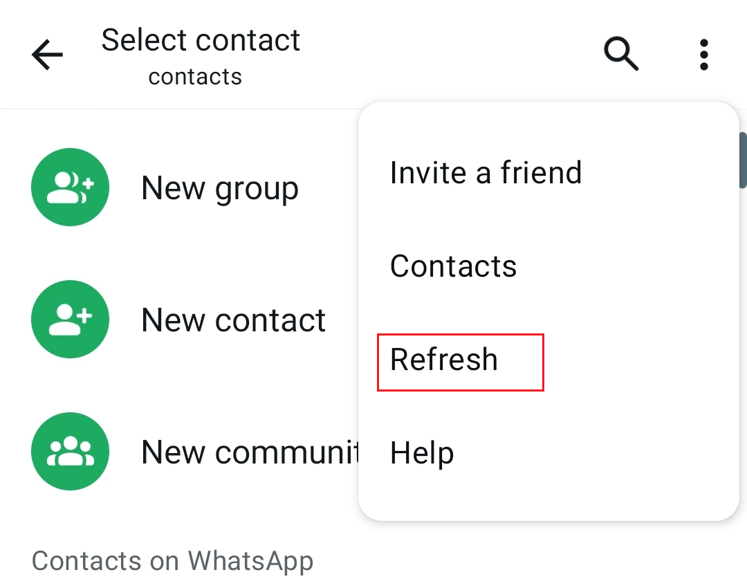 - Update contact list: Open WhatsApp, tap the three dots and then select Update.
