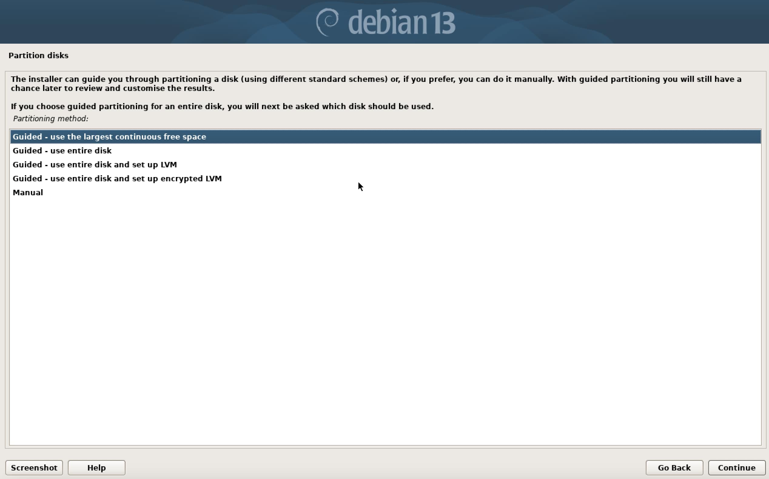 Next, you need to prepare the hard drive for installing Debian 13. Debian provides several options for partitioning the drive. For beginners, the option “Guided – use the largest continuous free space” is recommended, as it automatically creates all required partitions without manual setup.