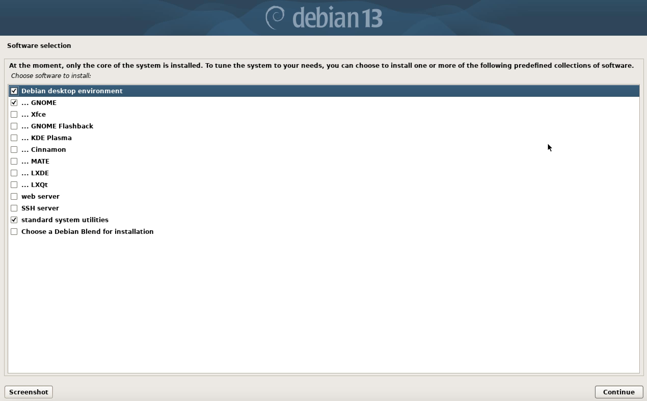 Optionally, you may include additional software packages, such as office applications or server tools. If you are uncertain, you can skip these for now, as more software can always be installed later via the package manager. Once you’ve made your selections, Debian continues with the installation process.