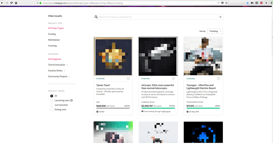 When it comes to its design, Indiegogo has a modern, minimalistic style. The simple structure of the website directs visitors’ attention to the campaigns. Navigating this crowdfunding site is smooth and simple. It is also well structured, especially the way the projects are sorted. In addition, projects can generally be sorted by popularity and funding strength. Otherwise, they are divided into the usual commercial categories and subcategories.