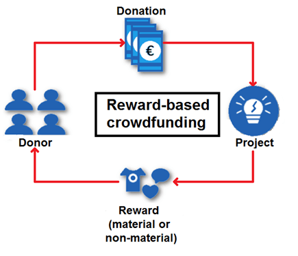 Classic crowdfunding collects donations and, in return, promises an end product. Giving small rewards to donors has also become the norm in crowdfunding, which is why the term “reward-based crowdfunding” is often used. These rewards can be non-material rewards (being credited, beta access, priority on pre-orders, etc.) or material rewards (merchandise, prototypes, etc.). Donors are often rewarded according to the amount they donate.