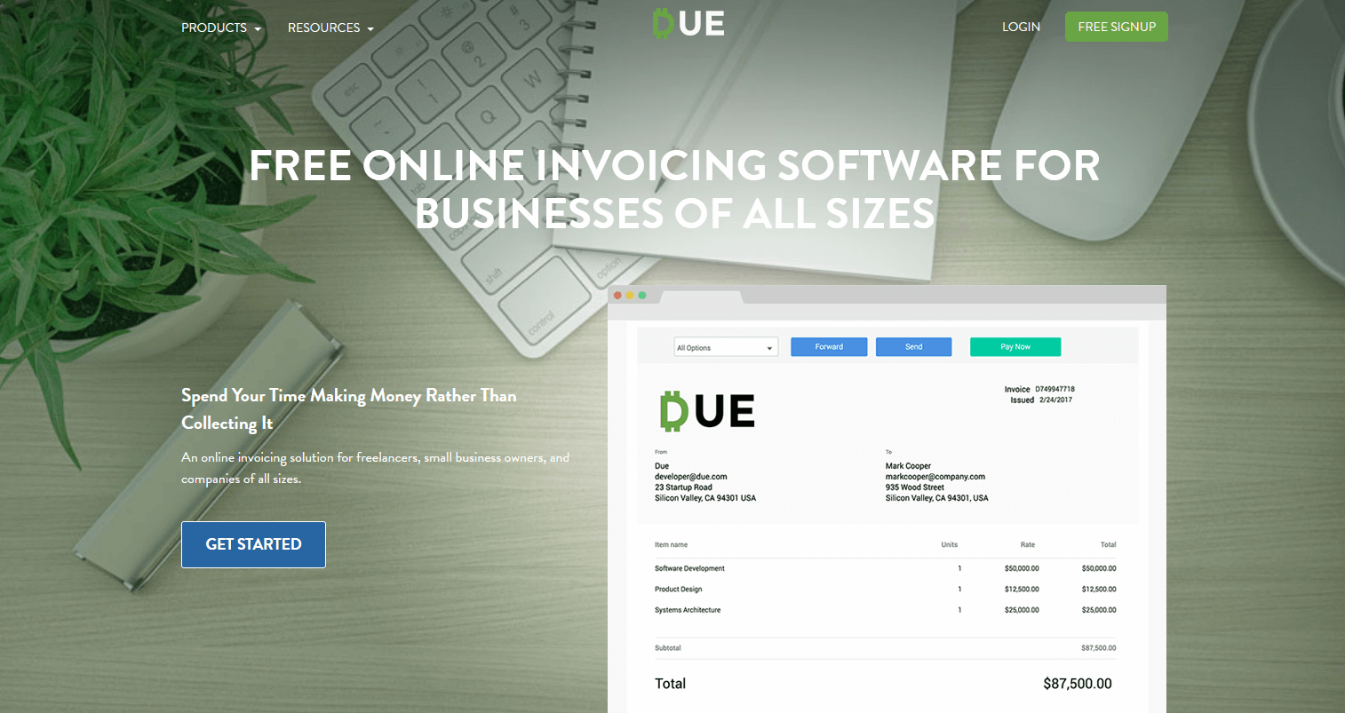 Due provides free invoicing software for businesses of any size. Due has an aesthetically pleasing interface and provides a plethora of helpful features, including customization – from logos, to invoice messages, to languages and currencies and even payment terms. Due is compatible with any sales tax/VAT rates and can help with tax and fee applications, as well as custom notes and terms. Invoices can be sent by email or PDF and you can easily duplicate invoices and send to multiple recipients. Due can be accessed from any computer or mobile device and all information is 256-bit SSL encrypted, with information stored in the cloud for easy access. The invoicing software works for unlimited clients so there is no paywall applied should your business grow in size.