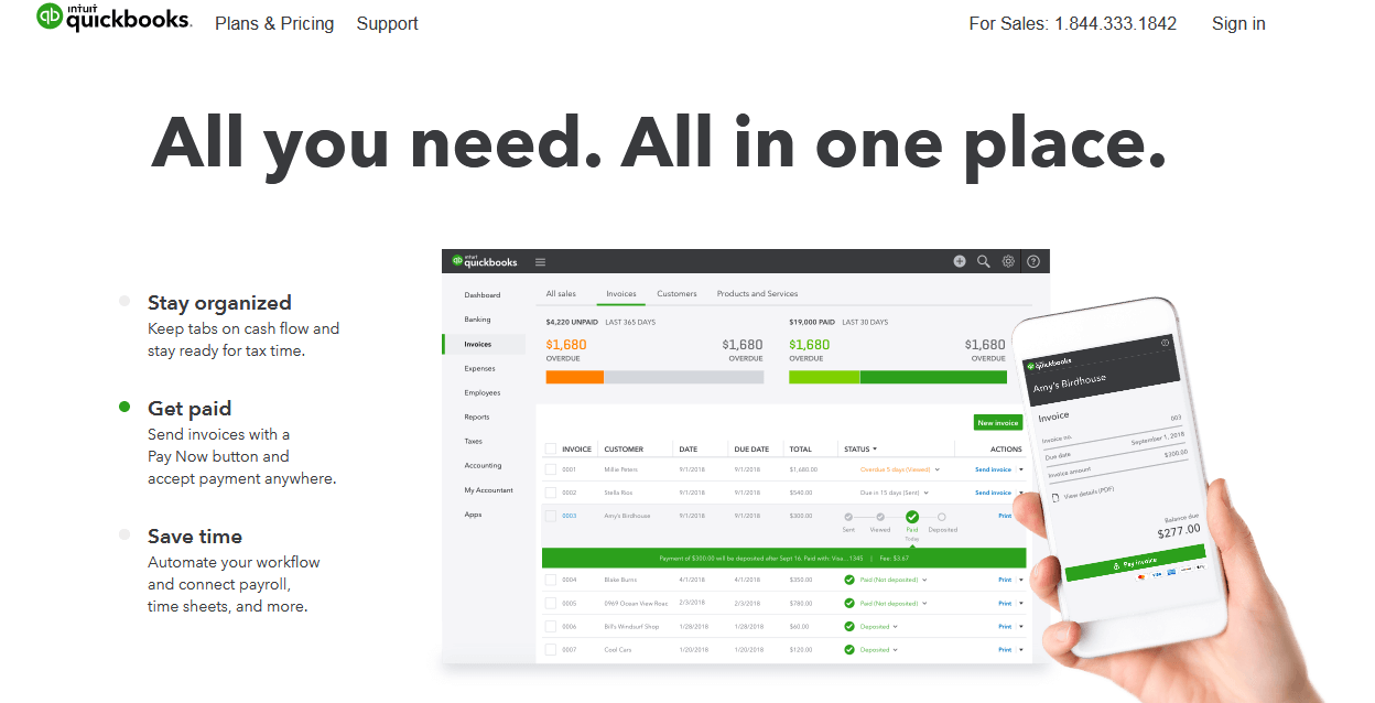 | QuickBooks | Freelancers, small businesses | High level – logo, currency, language, numerous templates to choose from | Web-based, iPhone app, Android app | $10-$60 | ✓ 30 days | ACH Bank transfer, credit card, phone payment, Apple Pay |