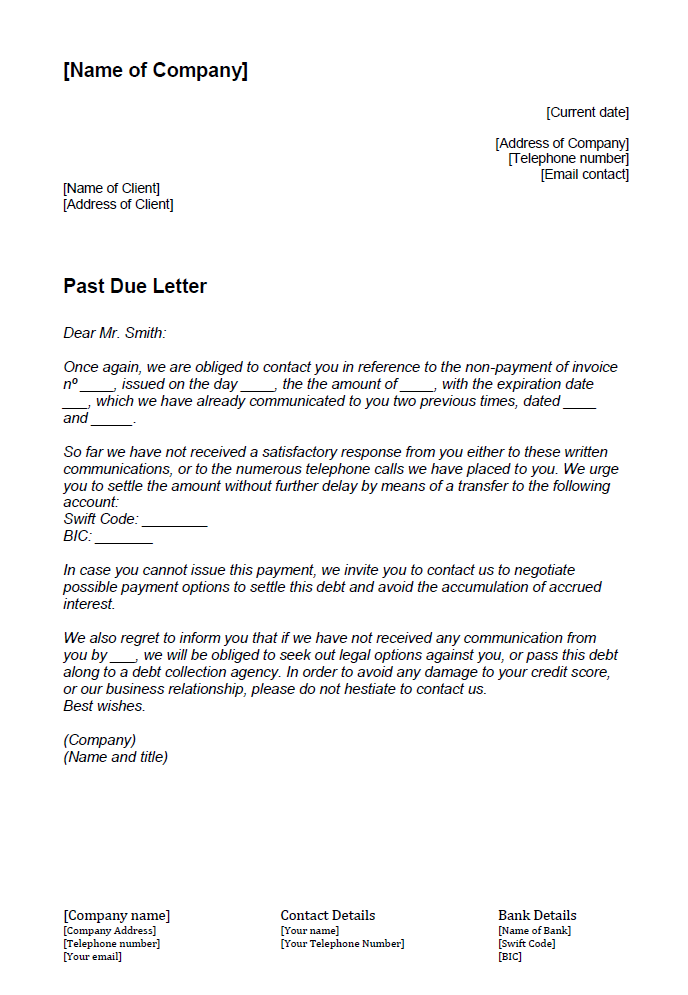 Avoid sending more than three past due letters, as you may risk your concerns not being taken seriously since no further consequences seem to be feared by the debtor.