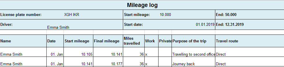 - Each individual journey must be entered with the mileage at the beginning and end, the distance covered, and a reference to the reason for the journey
