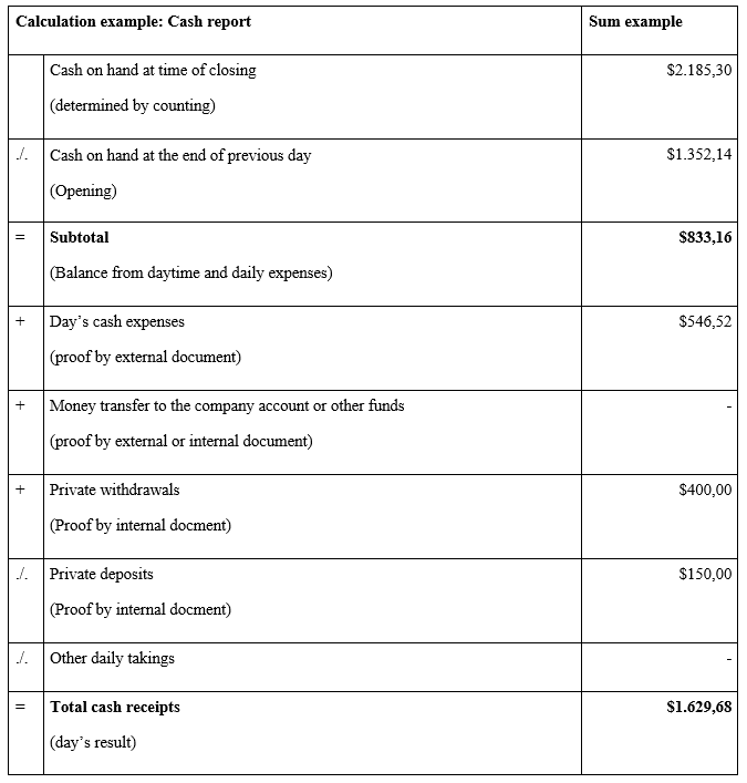 In any case, business owners who operate an open cash register are obliged to record the day’s transactions after the close of business. The finished records should correlate with the actual balance of the cash register at all times, in order to be considered competent bookkeeping.
