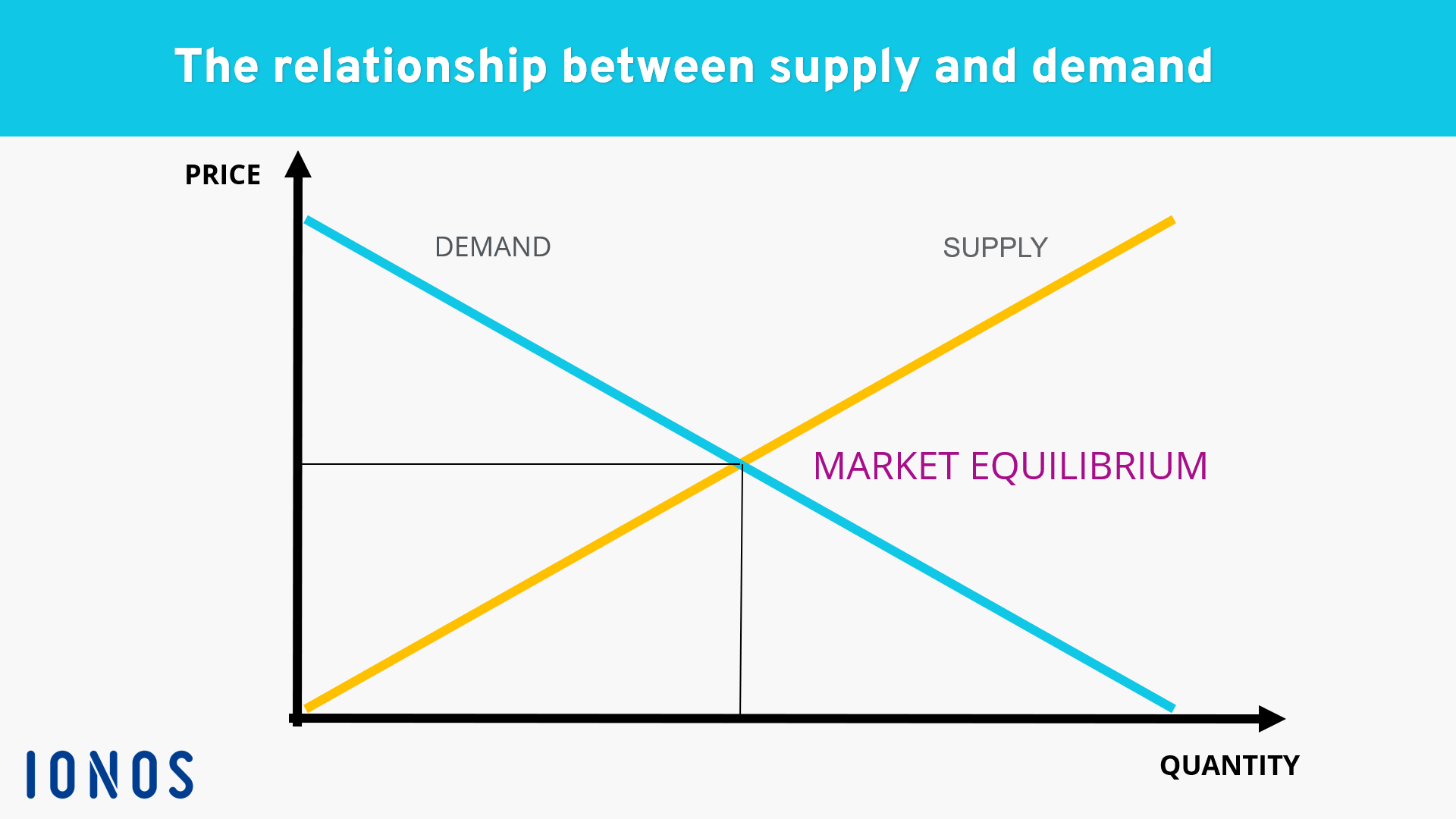 At the point where the supply curve and the demand curve intersect, the relationship between supply and demand is perfectly balanced. Exactly as much is produced as is required, and both the market price and production quantity remain stable. This is known as market equilibrium, although it is merely a theoretical figure. In reality, there is always alternating excess demand and supply. This phenomenon is often described with the phrase “the market regulates itself.”
