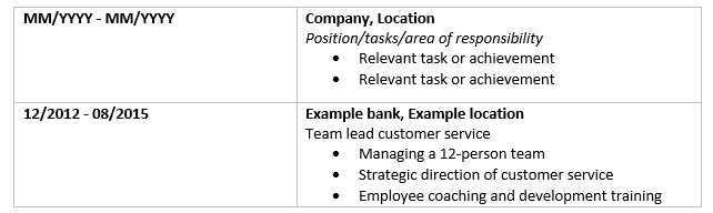 An example of the format of your CV’s professional background section can look something like this: