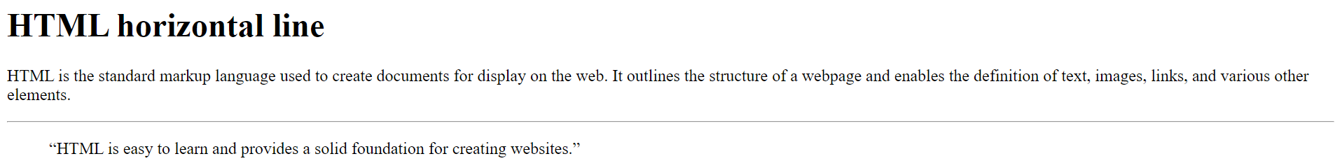 <hr>htmlWe’ll illustrate how this element works with a simple example. Below, we’re going to take a paragraph (<p>) and a quoted text (<blockquote>) and separate them in our HTML document using a horizontal line. The corresponding code looks like this: