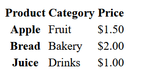To get a better idea of the syntax, let’s take a look at a simple example. In the table below, we have the categories and pricesfor three different products: apples, bread and juice. We’re going to create headings in both the header row and first column. The scope attribute defines whether a header cell refers to a row or a column: