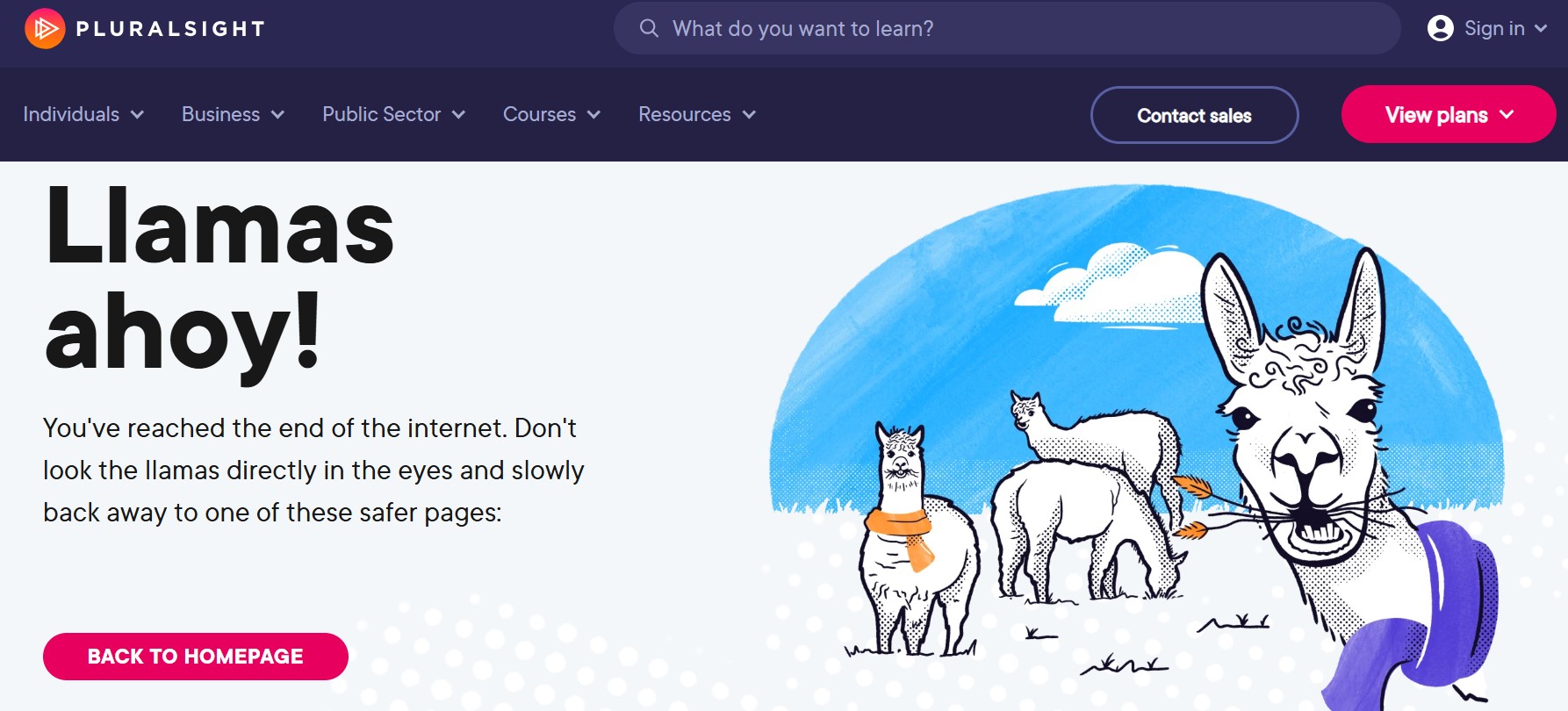 Pluralsight’s 404 page greets visitors with llamas, paired with the tongue-in-cheek advice to avoid eye contact and carefully head toward safer pages.
