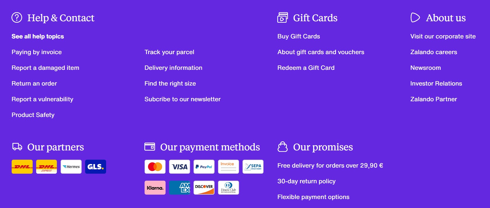 The footer of Zalando is also very extensive, yet remains clear thanks to its well-structured layout. It stands out with a strong service orientation, featuring links such as “Find the right size,” “30-day return policy,” multiple payment options, and a list of shipping partners. In addition, it includes links to all relevant legal texts, an “About us” section with information about partners and job openings, as well as references to Zalando’s mobile apps and various social media accounts.