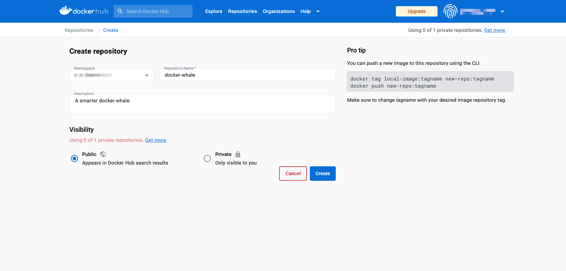 - Δημιουργήστε ένα αποθετήριο: Συνδεθείτε στο Docker Hub χρησιμοποιώντας το Docker ID και τον προσωπικό σας κωδικό πρόσβασης και δημιουργήστε ένα δημόσιο αποθετήριο με το όνομα docker-whale.