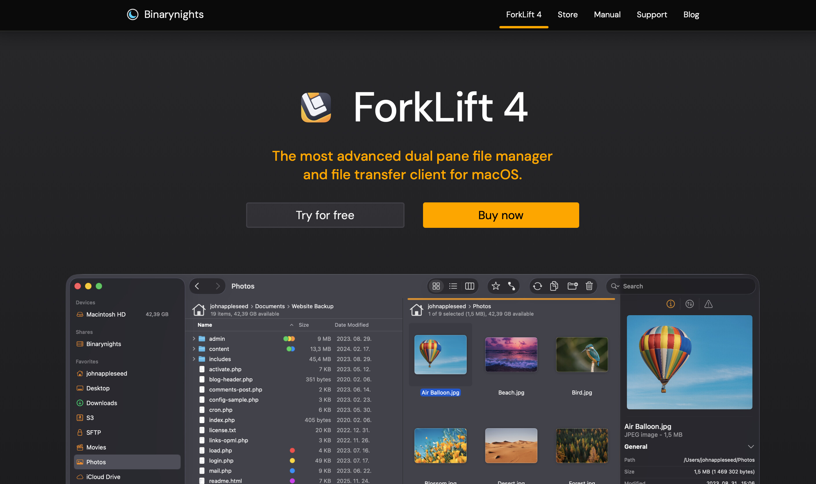 The FTP program ForkLift has been one of the most feature-rich solutions for Mac computers for years. The paid FTP software not only supports various protocols such as FTP, SFTP, SMB, AFP, and NFS, but also provides interfaces to online services like Amazon S3, Google Drive, and Backblaze B2. Users can establish connections to multiple servers at the same time and conveniently move files between them via drag and drop. In addition, entire directories can be synchronised (one-way or two-way) with a single click, making it possible, for example, to transfer changes to local files to the FTP server in no time at all—and files can also be renamed in batches. Here’s an overview of Forklift’s features:
