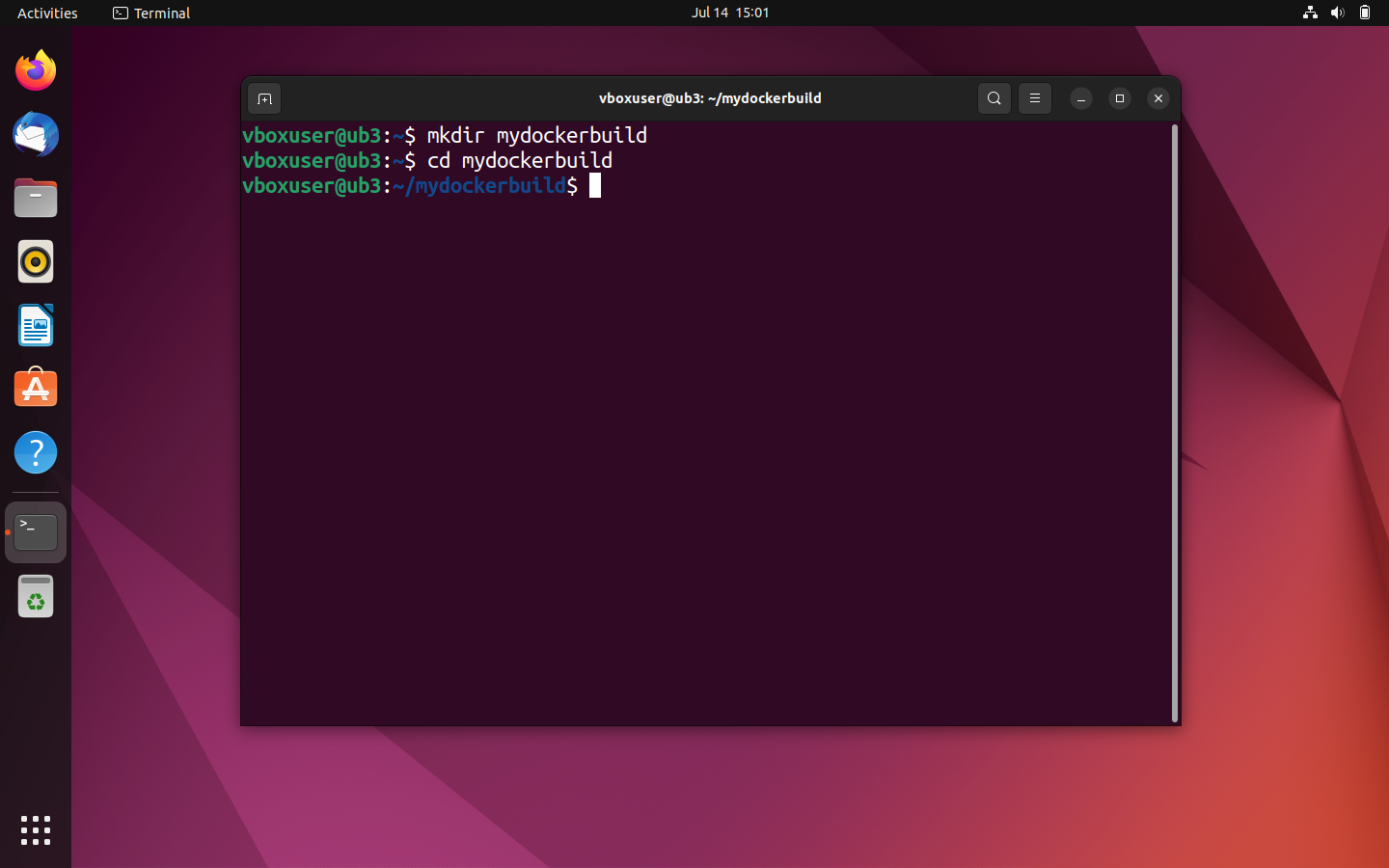 - Create new directory: The Docker developer team recommends creating a new directory for each Dockerfile. Directories are easily created under Linux in the terminal. Use the following command line directive to create a directory with the name mydockerbuild: