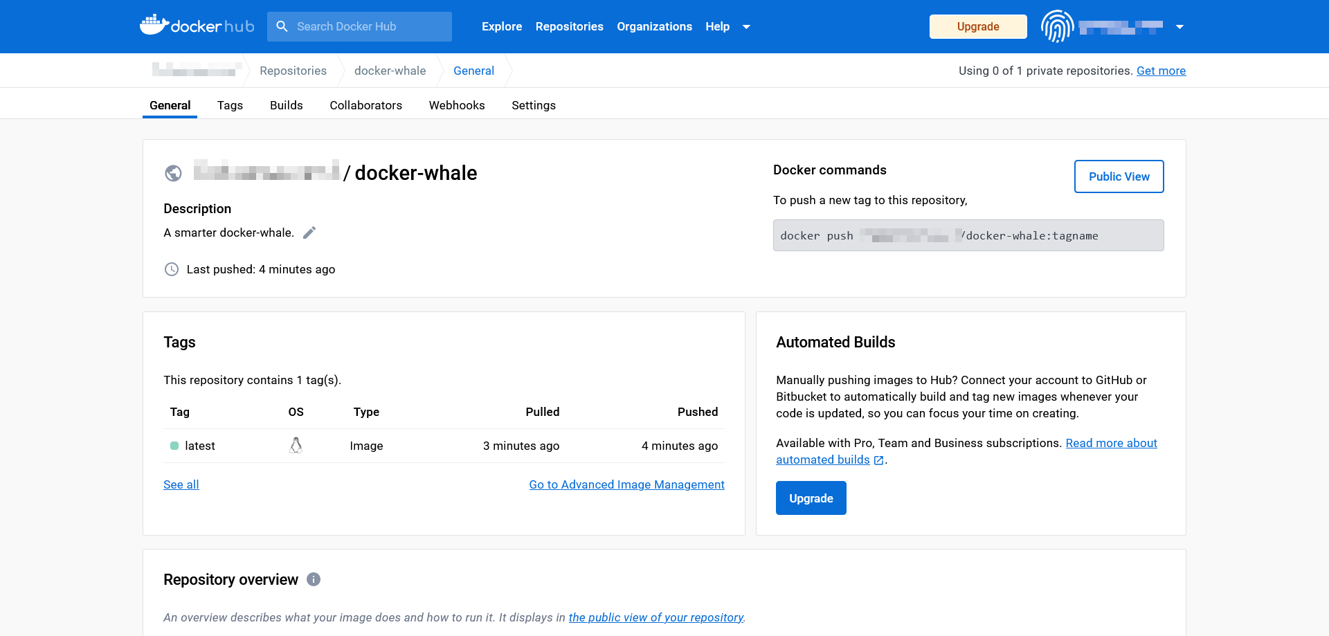 If you want to upload your custom docker-whale image to the hub and make it available to either the community or a workgroup, you first need to link it with a repository of the same name in your own personal namespace. In the Docker terminology, this step is known as tagging.