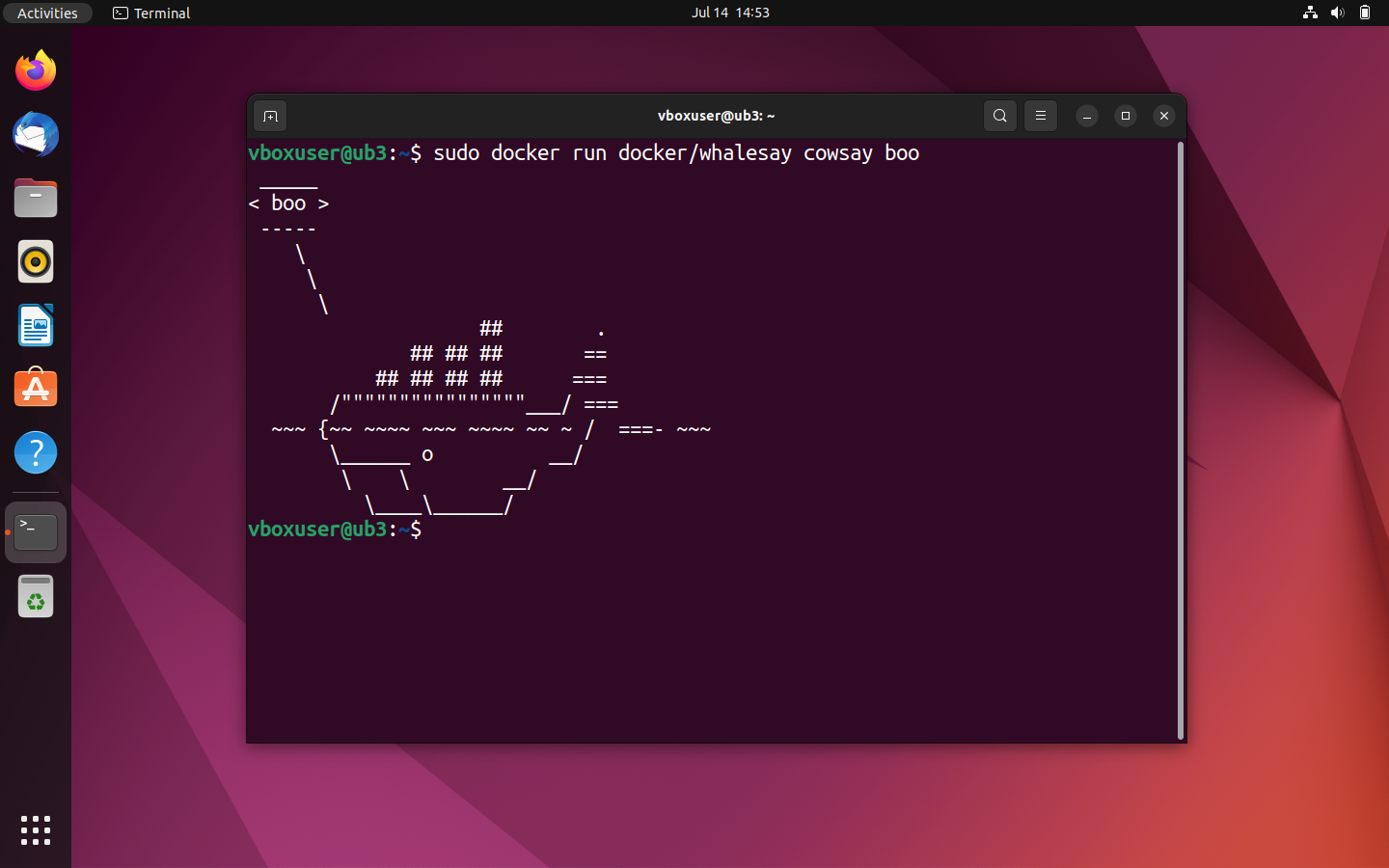 If the image docker/whalesay is run, the script outputs an ASCII graphic in the form of a whale as well as the text message ‘boo’, passed with the cowsay command in the terminal.
