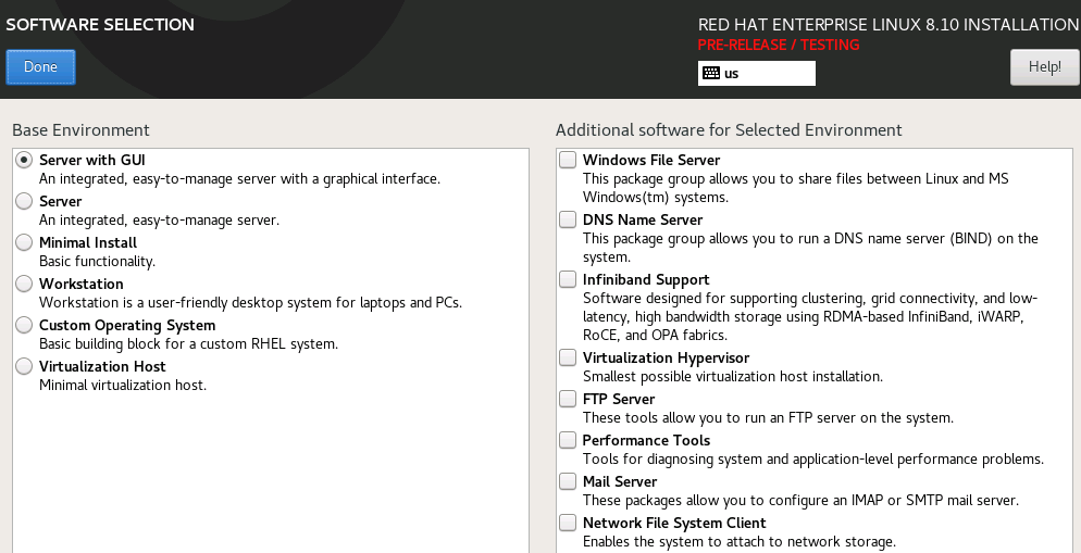 - In each case, the desired installation environment (installation target) must be specified. It is also necessary to select the desired installation package such as ‘Server with GUI’ under Software Selection. You can also add additional software such as an FTP server to the installation at this point. Confirm the respective settings by clicking on ‘Done’.