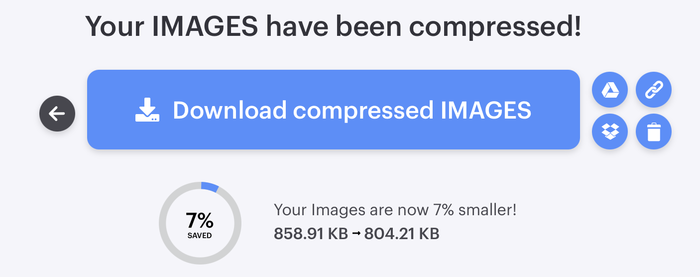 While iLoveIMG only has a single, default compression mode, the tool provides several different export options. It is not only possible to download the results to the local hard disk, but also to upload them to Google Drive and Dropbox and to forward a download link to the compressed images. If you are not satisfied with the compression result, you can simply delete it by clicking on the recycle bin icon.