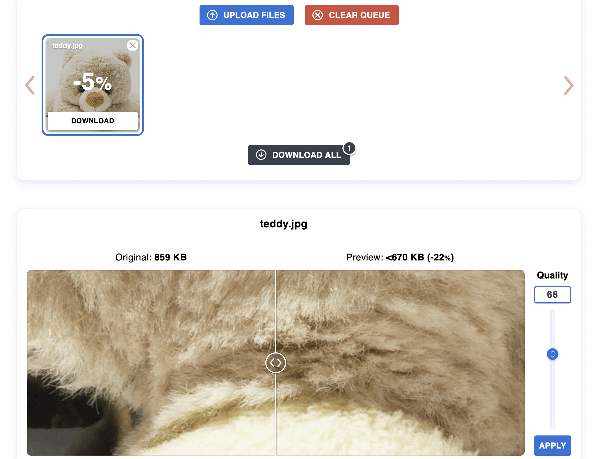 To help you find the best possible settings, Optimizilla provides you with thumbnails of the original and its compressed counterpart. In addition, the tool specifies the respective file size. All uploaded images are automatically deleted from the provider’s servers after one hour.