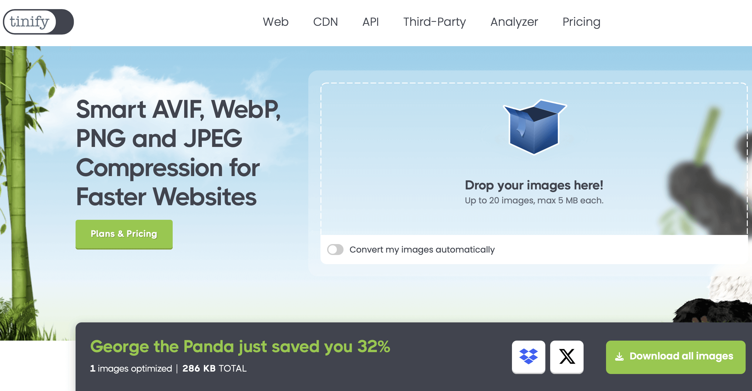 TinyPNG allows – contrary to its name – not only the compression of PNG files, but also JPEG and WebP files. In the free standard version, you can optimise up to 20 images of these three formats simultaneously, with the maximum file size per image limited to 5 megabytes.