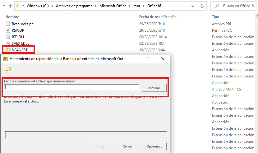 - Aparecerá el campo “Introducir el nombre del fichero a comprobar”. Introduce el nombre del archivo PST que deseas comprobar. Si no tienes listo el nombre, tienes la alternativa de buscar y seleccionar el archivo en cuestión con “Examinar”.