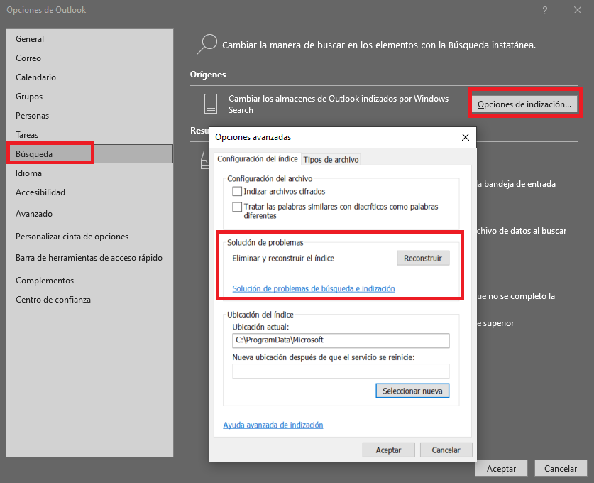 - A la derecha verás el campo “Opciones de indexación…”. Haz clic en él. Ahora verás una ventana con todas las ubicaciones indexadas por Outlook.