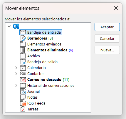 En el siguiente paso, selecciona la carpeta a la que deseas mover el correo electrónico de la papelera y confirma haciendo clic en “Aceptar”.