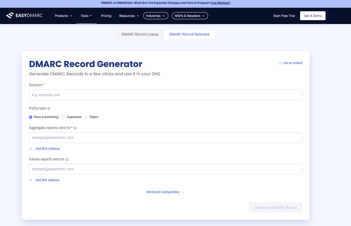 Puedes utilizar una herramienta en línea como el generador de registros DMARC Record Generator de EasyDMARC. Solo tienes que introducir tu dominio y seleccionar las opciones que quieras aplicar (política, direcciones para los informes, nivel de alineación, etc.).
