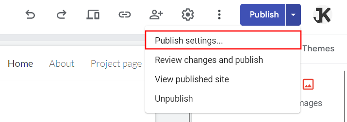 Una vez hayas iniciado sesión exitosamente en el servicio de Google Sites, selecciona el Google Site que quieres asociar al dominio. Haz clic en el menú desplegable ubicado junto al botón “Publicar” y elige la opción “Configuración de publicación”.