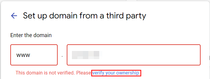 Dado que ya tenemos un dominio, seleccionamos la primera opción e introducimos el dominio en la siguiente ventana de diálogo. Recibirás una notificación informándote de que el dominio indicado aún no está verificado. Haz clic en el enlace que dice “Por favor, confirma la propiedad” para continuar con el proceso.