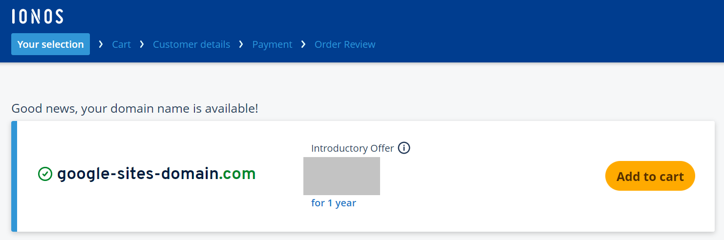 Puedes completar el registro de tu propio dominio para tu página web de Google Sites de dos formas: creando una cuenta de cliente en IONOS o pagando directamente a través de PayPal.