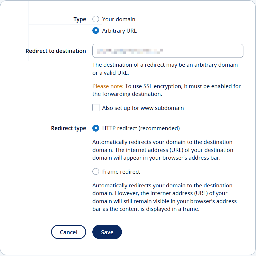 paginewebejemplo.es, introduce aquíww.paginewebejemplo.es. - Haz clic en “Redireccionamiento HTTP” en “Tipo de redirección” y guarda los cambios. En unos minutos, también debe de poderse acceder a tu página web con www.