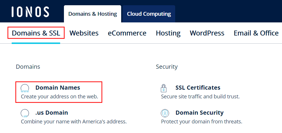 En IONOS, puedes adquirir tu propio dominio para tu página web en Google Sites de forma sencilla. Para hacerlo, simplemente visita la página principal de IONOS, dirígete a la sección de productos y selecciona “Dominio”. A continuación, haz clic en “Comprar dominios”.