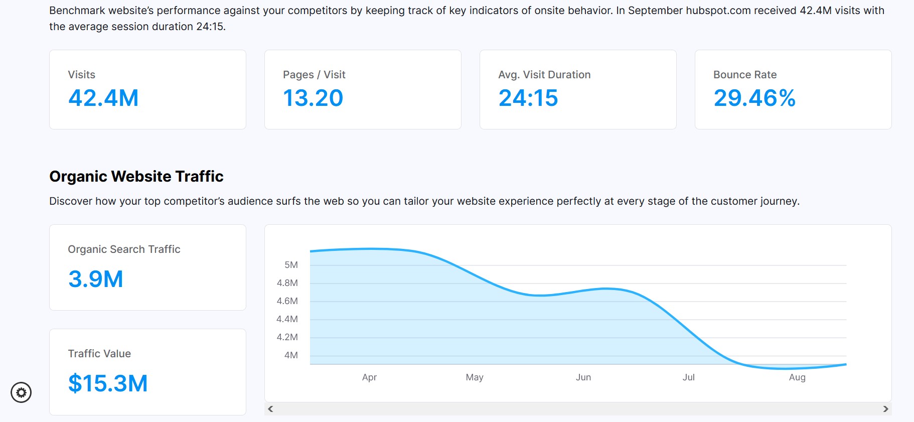 Una de las herramientas más populares para el análisis del tráfico web es SimilarWeb. Para empezar a utilizarla, simplemente escribes el dominio y en poco tiempo recibirás los datos. Esta herramienta recuerda un poco a Google Analytics en cuanto al alcance y al tratamiento de los datos. La presentación de los resultados del análisis es clara y bastante completa: se puede ver, por ejemplo, el desarrollo del tráfico por períodos y los distintos canales de tráfico, como redes sociales, tráfico directo o correo electrónico.
