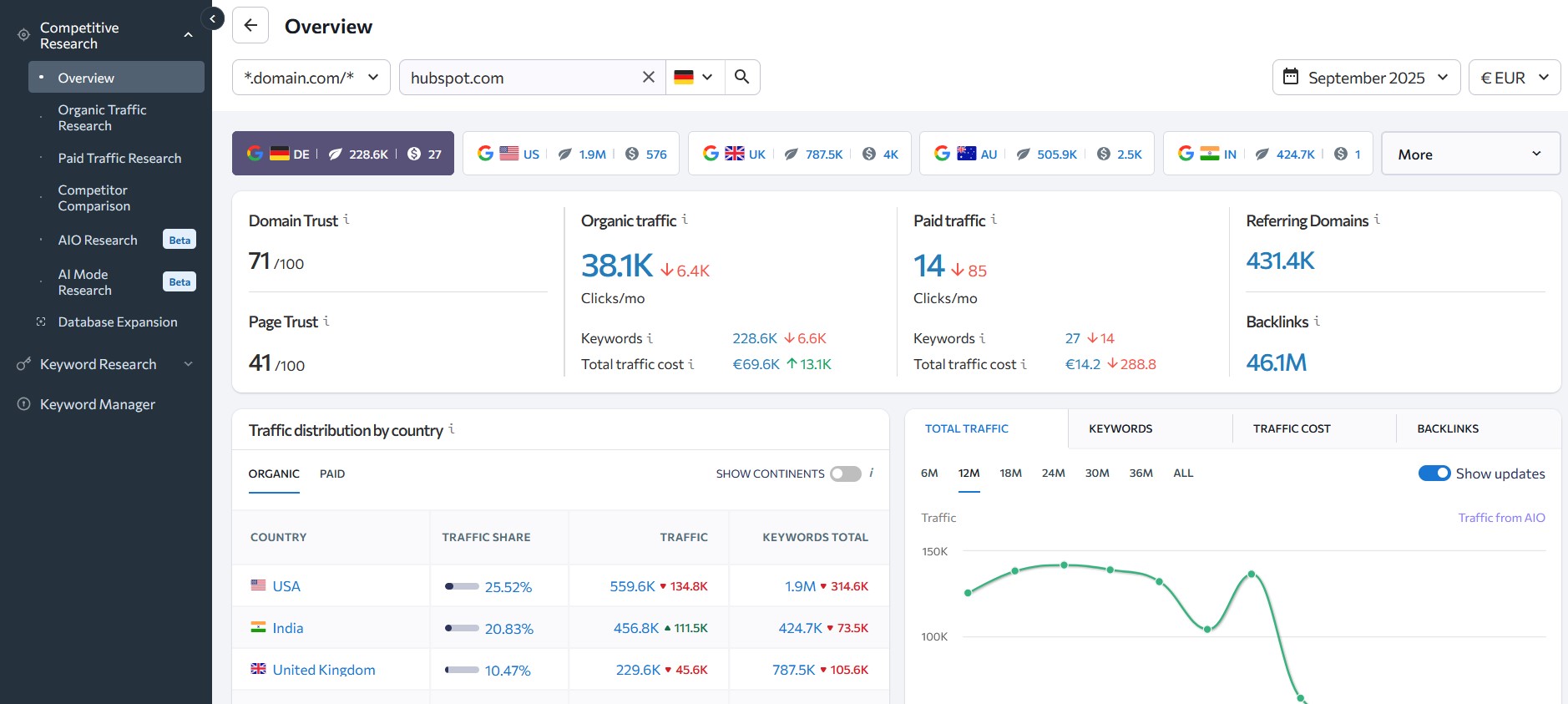 Otra función destacada es la comparación de dominios, que permite analizar varias páginas en paralelo. De este modo, puedes comparar directamente los rankings, los patrones de tráfico y los backlinks de tus competidores.