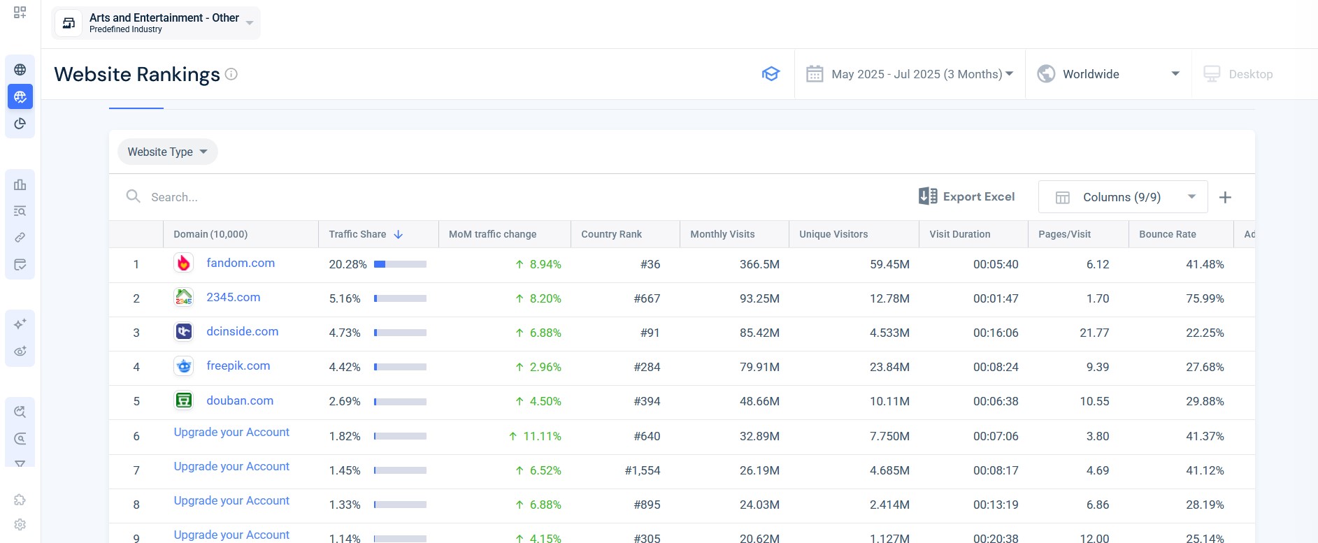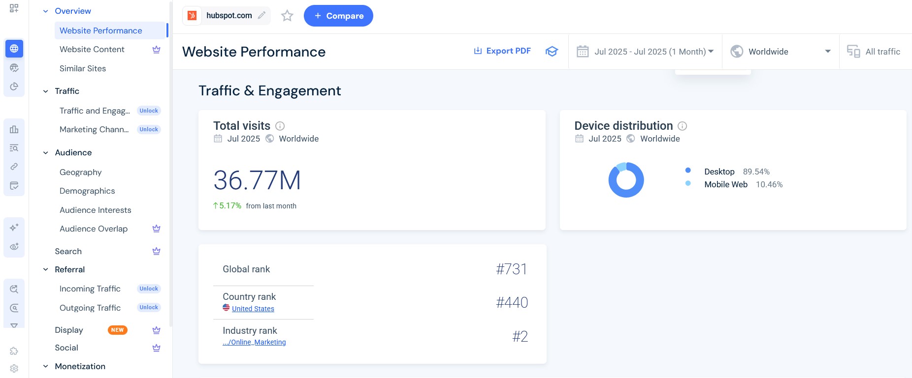 SimilarWeb no siempre ofrece datos totalmente precisos sobre el tráfico. Sin embargo, la herramienta ofrece una buena visión general y también desglosa las diversas fuentes de tráfico. La función “Top Websites Ranking” es ideal para identificar las mejores páginas web de cada industria con unos pocos clics.