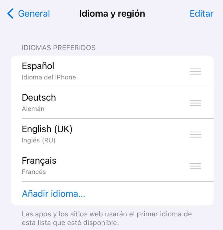 Paso 6: el idioma seleccionado se establece automáticamente como el idioma de tu sistema operativo iOS. Además, encontrarás ese mismo idioma en la parte superior de la lista de “Orden preferido para los idiomas”. Si quieres seleccionar otro idioma de la lista de idiomas preferidos, pulsa sobre él y arrástralo a la parte superior de la lista.