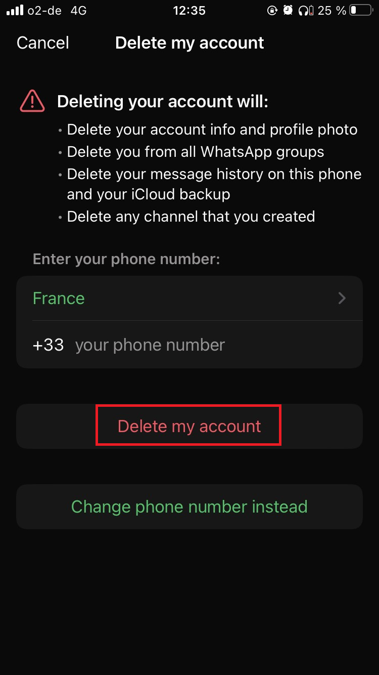 - Confirmar la eliminación: el sistema te avisa de que, si eliminas tu cuenta de WhatsApp, se borrará toda la información de la cuenta, la foto de perfil, los historiales de mensajes y los grupos de WhatsApp, así como las copias de seguridad de iCloud o Google Drive si corresponde. Después de escribir el número de teléfono, confirma con “Eliminar mi cuenta” (Delete my account).