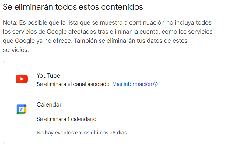 Si borras tu perfil de Google, perderás el acceso a los servicios que requieren tener una cuenta como, por ejemplo, Gmail, Drive, Play o Calendar. Además, se perderán todos los datos y el contenido asociados a estos servicios (como correos electrónicos, archivos, fotos, marcadores o anotaciones en el calendario). Tampoco será posible acceder a las suscripciones o al contenido de pago adquirido en YouTube o Google Play después de borrar tu cuenta de Google. Además, como usuario de Android, ya no podrás descargar o actualizar aplicaciones de Play Store ni almacenar archivos en la unidad de Google.